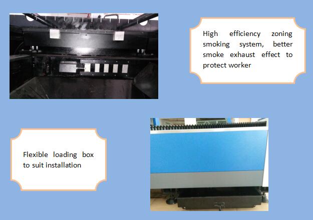3. Alta efika zoniga fumada sistemo ambaŭflanke de maŝina korpo, Forta segmentita polvo kaj fumado-kolekto, ĝi reduktos damaĝon al laboristo.